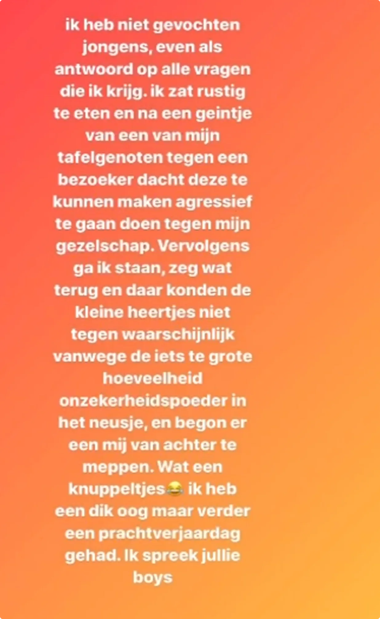 In zijn Instagram Stories vertelt Barend wat er is gebeurd: "Ik zat rustig te eten en na een geintje van een van mijn tafelgenoten tegen een bezoeker, dacht deze te kunnen maken agressief te gaan doen tegen mijn gezelschap. Vervolgens ga ik staan, zeg wat terug en daar konden de kleine heertjes niet tegen."