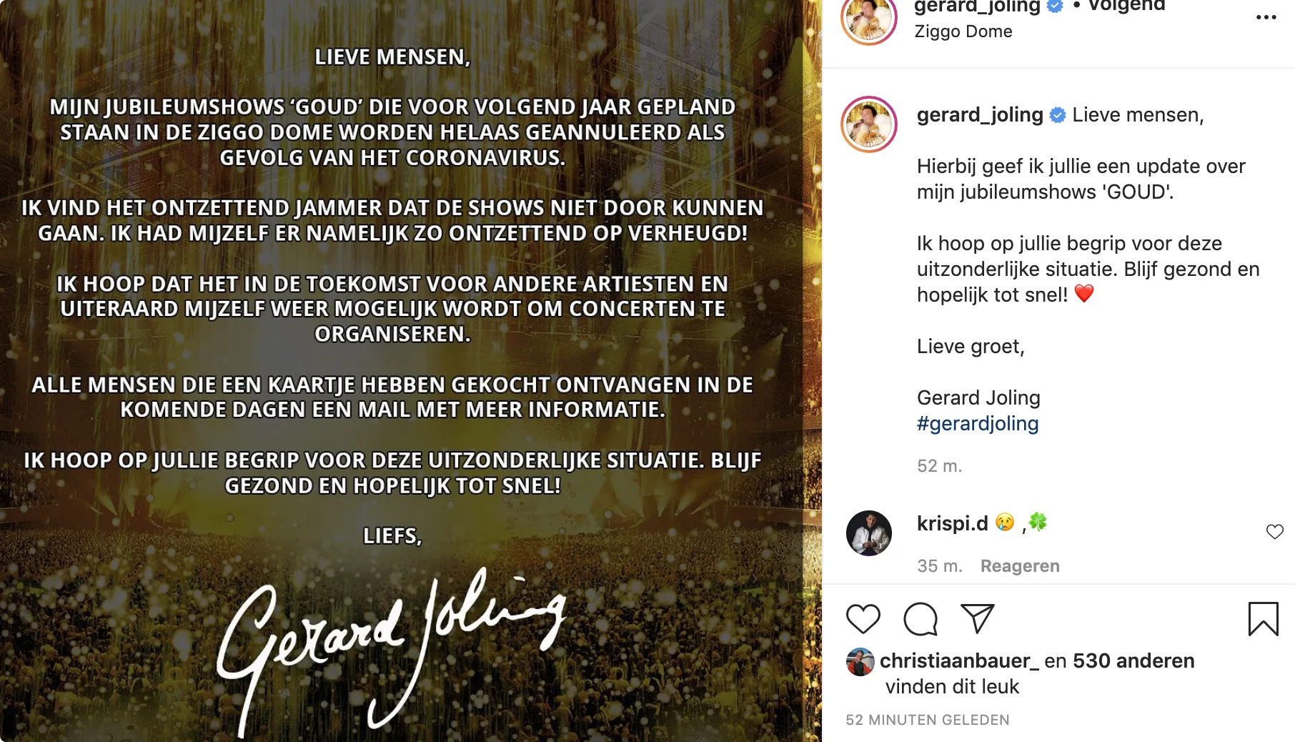 "Ik vind het ontzettend jammer dat de shows niet door kunnen gaan. Ik had mijzelf er namelijk zo ontzettend op verheugd", schrijft Gerard dinsdagochtend op Instagram. Fans met kaartjes ontvangen in de komende dagen een e-mail met meer informatie over de annulering.