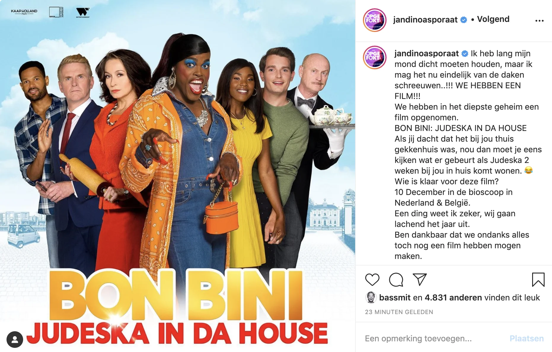Jandino Asporaat komt in december met een bioscoopfilm rond zijn typetje Tante Judeska. De cabaretier heeft de film, Judeska in da House, de afgelopen maanden in het geheim gedraaid. In de bioscoopfilm bevinden Judeska en allerlei andere personages zich in lockdown.