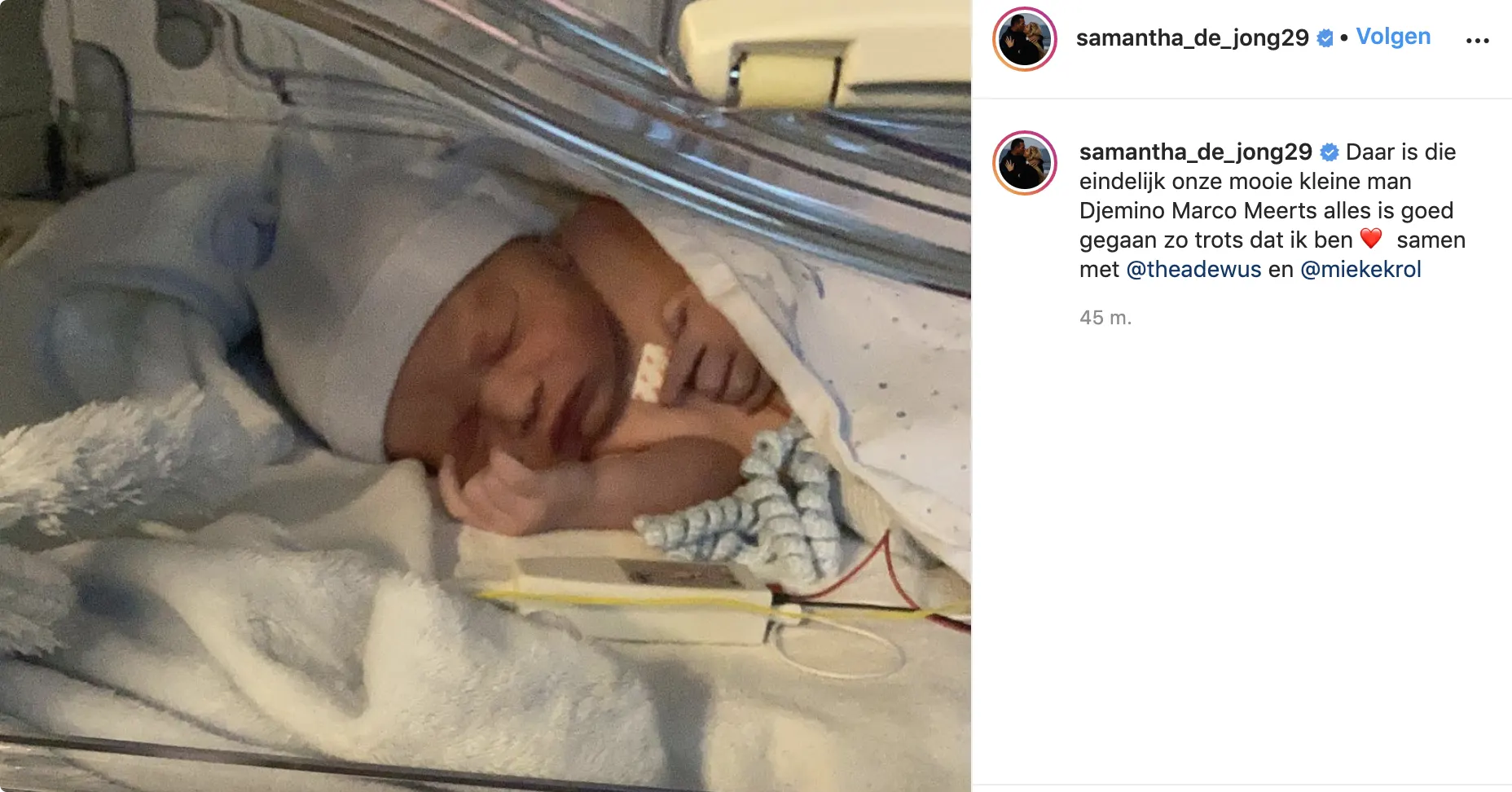 "Daar is die eindelijk onze mooie kleine man Djemino Marco Meerts", schrijft 'Barbie' onder een foto van het kindje. "Alles is goed gegaan zo trots dat ik ben."