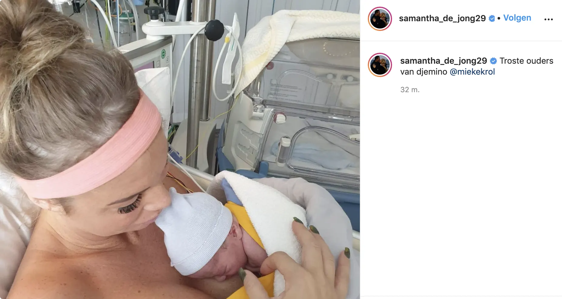 Na een lange dag en nacht in het ziekenhuis mogen Samantha de Jong en haar vriend Gerrit Meerts eindelijk zoontje Djemino in de armen sluiten. Het kind is met een geplande keizersnede ter wereld gekomen.