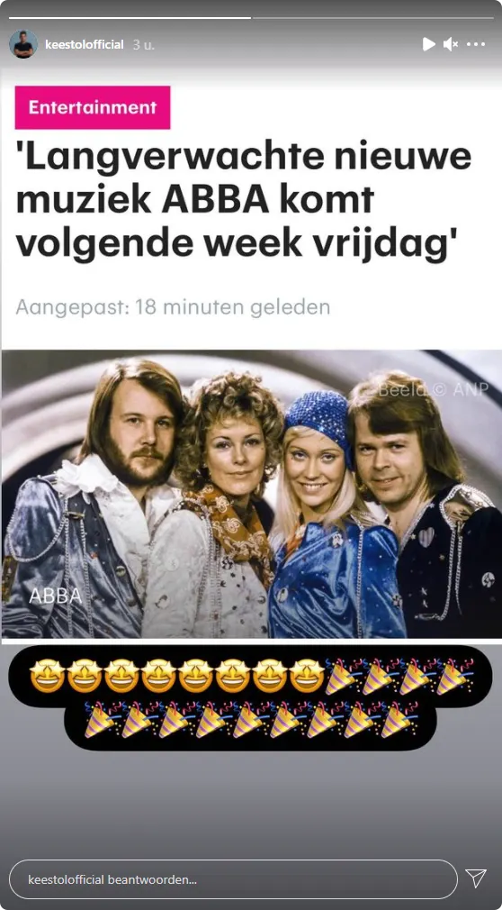 De bandleden van ABBA hebben er volgens de tabloid zin in. "Bjorn, Benny, Agnetha en Anni-Frid hebben zo lang op dit moment gewacht." En ook Kees Tol kan niet wachten op de comeback. Zo deelt hij op Instagram. "Ik word niet goed", deelt hij. "Zou het echt gaan gebeuren?"