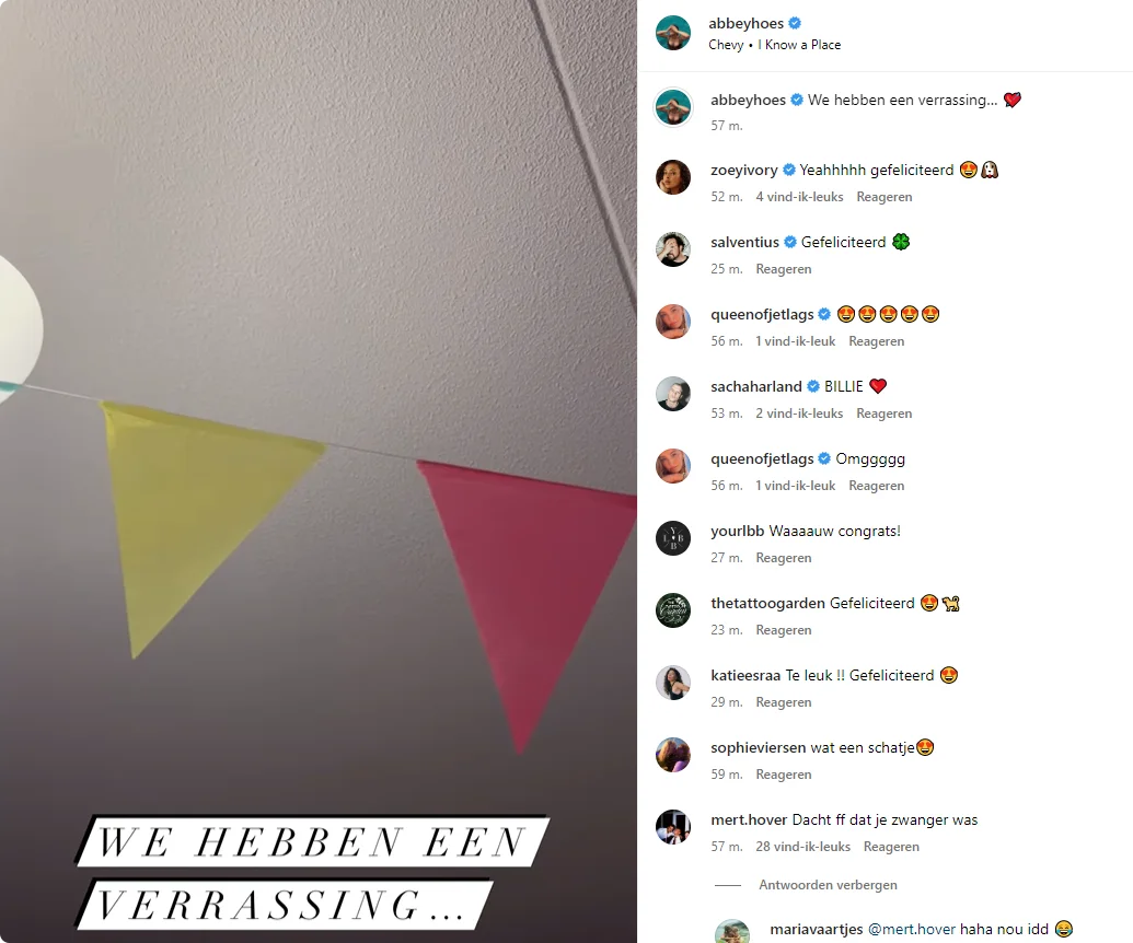 "We hebben een verrassing", zo schreef Abbey bij het heuglijke nieuws op Instagram. In de video bovenaan de pagina is te zien hoe de actrice en haar vriend het nieuws bekend maken.