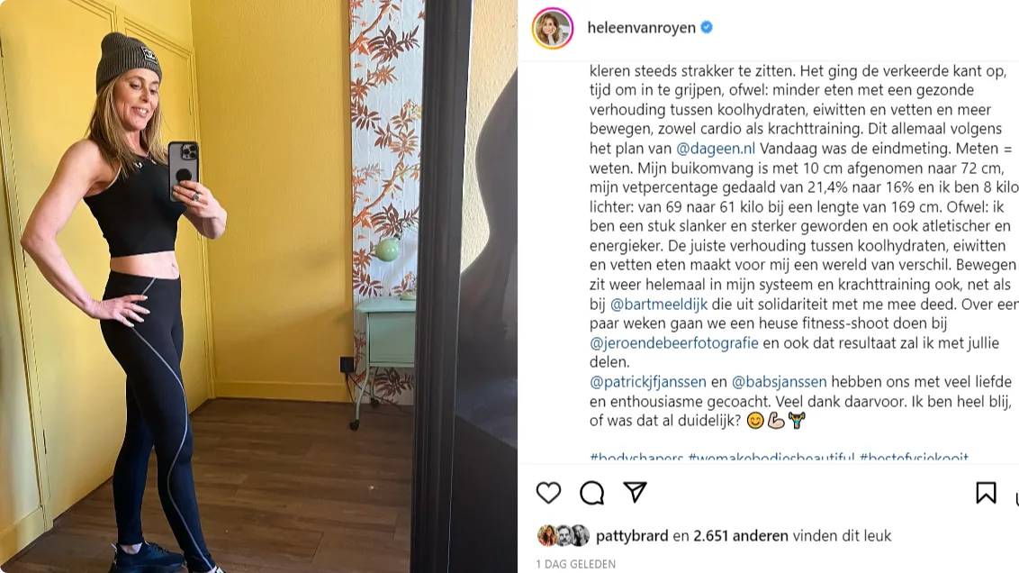 Op Instagram schrijft ze onder meer: "Vandaag was de eindmeting. Meten = weten. Mijn buikomvang is met 10 cm afgenomen naar 72 cm, mijn vetpercentage gedaald van 21,4% naar 16% en ik ben 8 kilo lichter: van 69 naar 61 kilo bij een lengte van 169 cm. Ofwel: ik ben een stuk slanker en sterker geworden en ook atletischer en energieker."