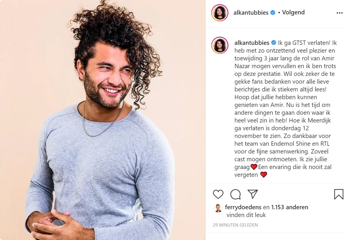 Dit vertelt de Amir-acteur in RTL Boulevard. "Het is waar dat Amir Meerdijk gaat verlaten", zegt Alkan. "Na drieënhalf jaar vonden de schrijvers dat het verhaal wel is verteld, en dat vond ik ook."