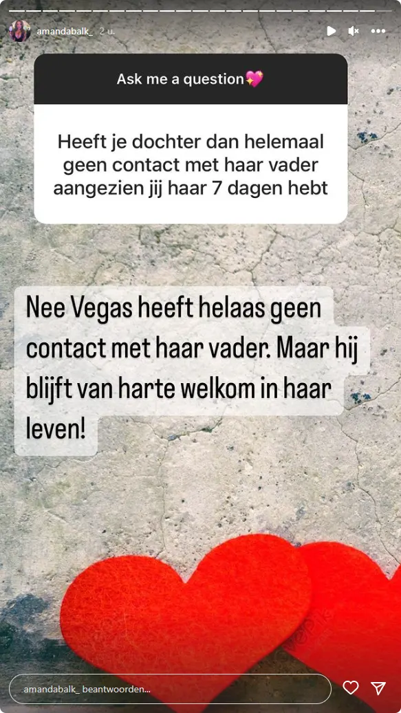 Tijdens een 'vraag maar raak'-sessie op Instagram, ook wel Q&A genoemd, beantwoordt Amanda Balk een opvallende vraag. Een van haar volgers vraagt de mediapersoonlijkheid of dochtertje Vegas helemaal geen contact meer heeft met haar vader...