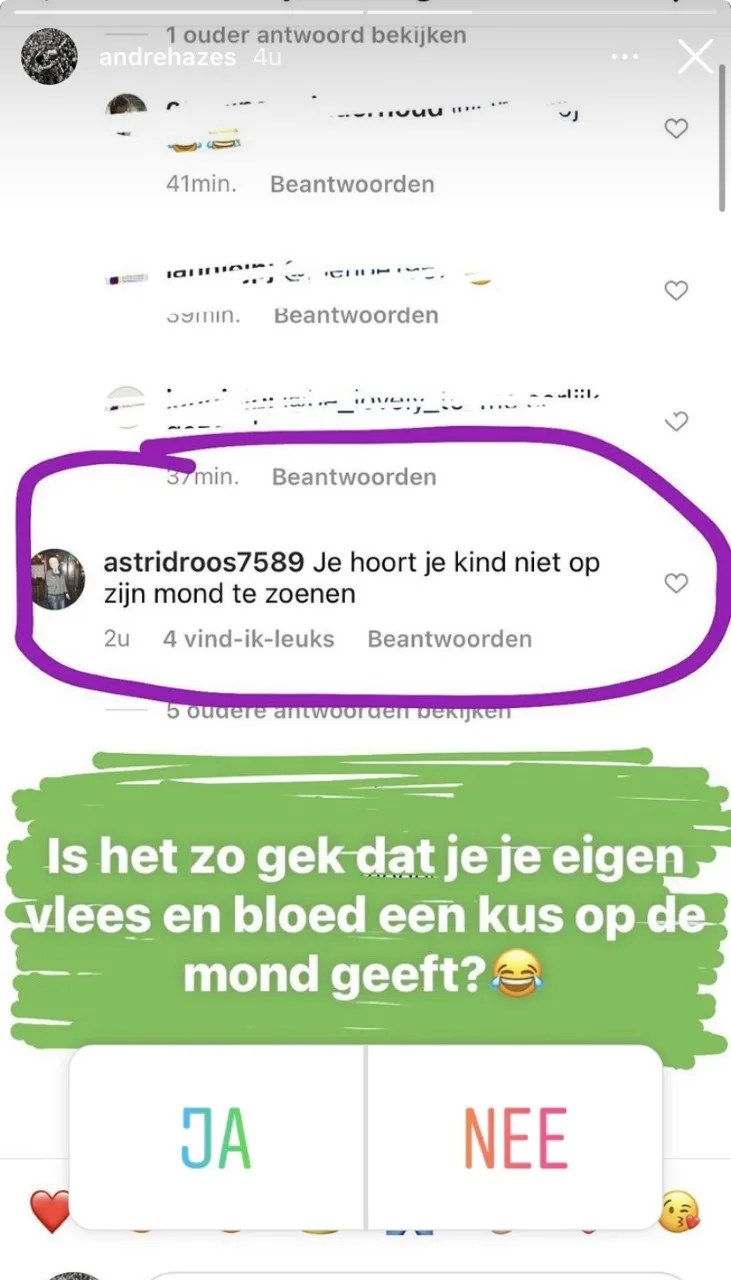 Zondagavond plaatste André een schattige foto met zijn 4-jarige zoontje. Op kiekje is te zien dat de twee elkaar een kusje op de mond geven. Voor velen een schattig moment, maar een aantal volgers vinden het maar niets. "Je hoort je kind niet op zijn mond te zoenen", reageert een volger van André.