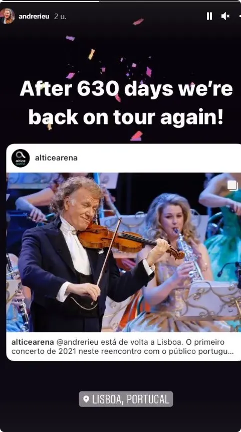 Rieu geeft de komende dagen nog drie concerten in Lissabon. De violist moest in maart 2020 al zijn optredens in de VS en Europa afzeggen vanwege de coronacrisis. Het leek er lange tijd op dat hij in december in Maastricht weer een reeks kerstconcerten kon doen. Maar deze zijn toch weer afgelast vanwege de nieuwe coronalockdown in Nederland.