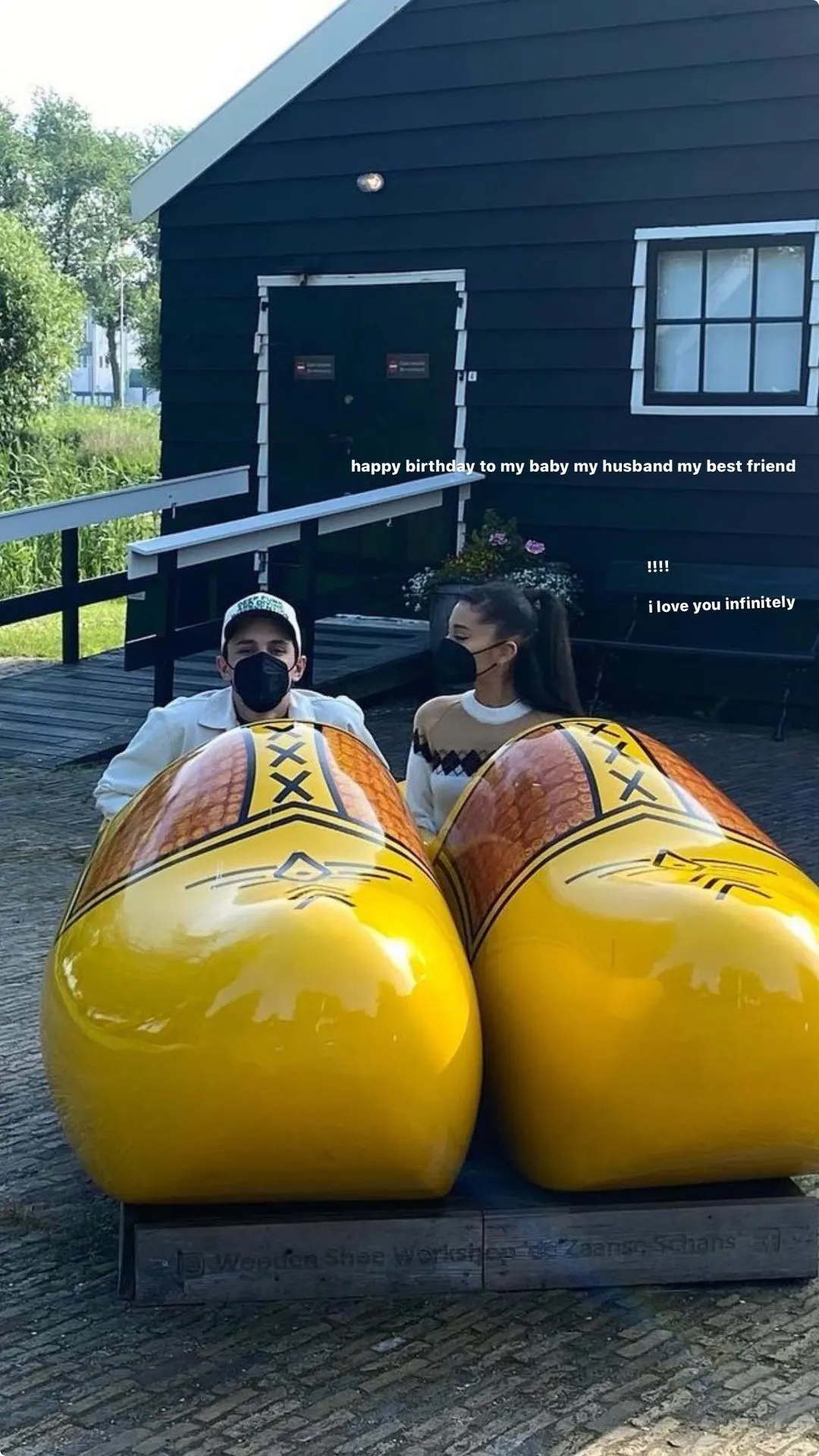 "Gefeliciteerd mijn schat, mijn man, mijn beste vriend. Ik hou oneindig veel van je", schrijft Grande bij een plaatje waarop de twee de Zaanse Schans bezoeken. Het pasgetrouwde koppel zit op de foto in twee gigantische houten klompen.