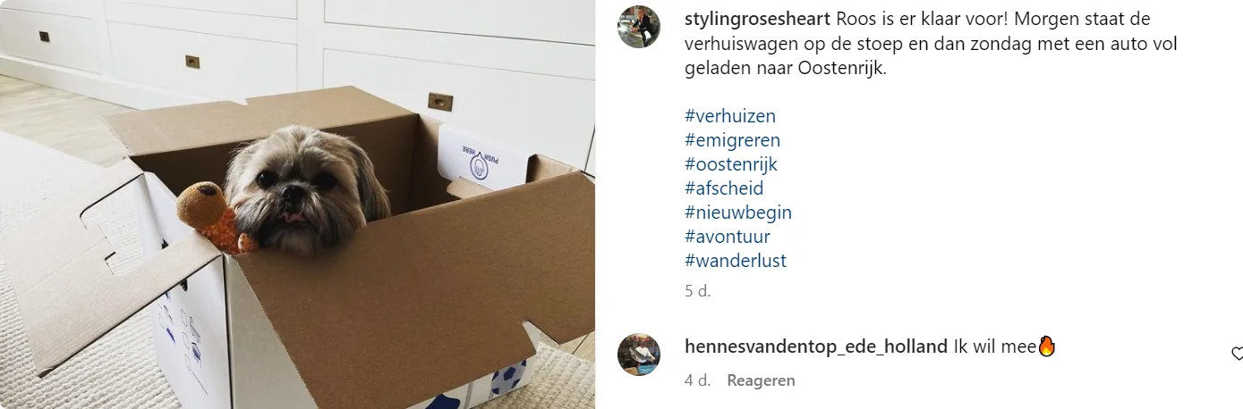Eerder deelde ze al een foto van haar hond Roosje in een verhuisdozen.