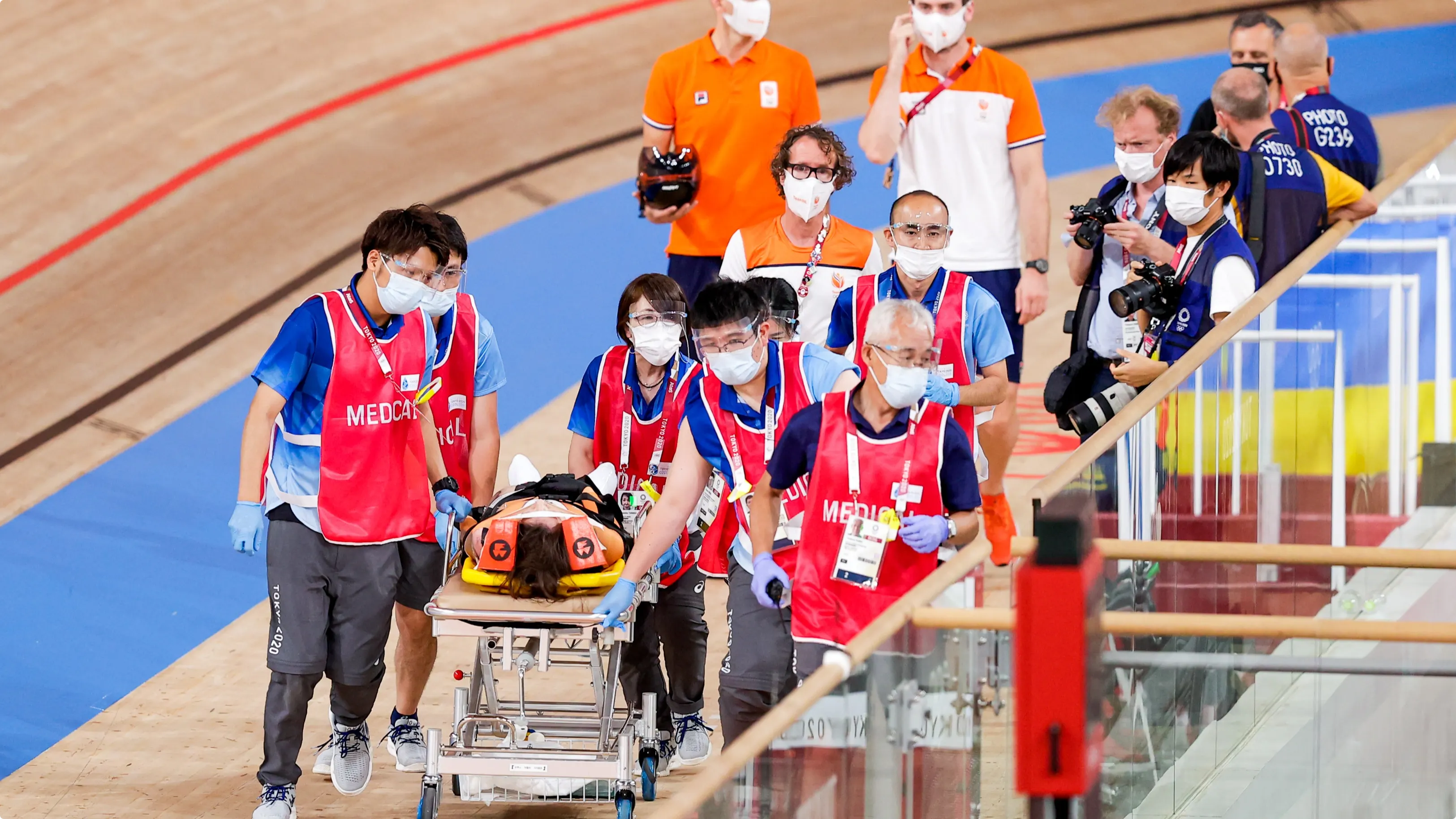 Laurine van Riessen is na een val op het onderdeel keirin op de Olympische Spelen naar een ziekenhuis gebracht.