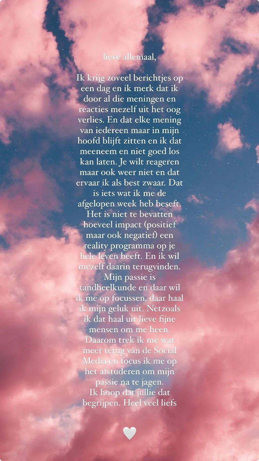 “Dat is iets wat ik me de afgelopen week heb beseft. Het is niet te bevatten hoeveel impact (positief, maar ook negatief) een reality programma op je hele leven heeft. En ik wil mezelf daarin terugvinden. Mijn passie is tandheelkunde en daar wil ik me op focussen, daar haal ik mijn geluk uit. Net zoals ik dat haal uit lieve fijn mensen om me heen. Daarom trek ik me wat meer terug van de social media en focus ik me op het afstuderen om mijn passie na te jagen. Ik hoop dat jullie dat begrijpen. Heel veel liefs.”