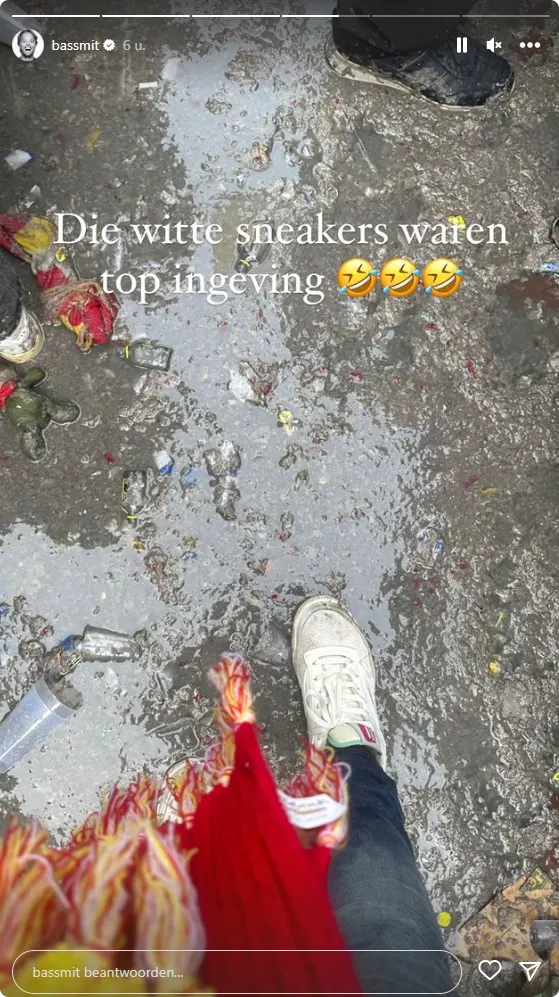De Amsterdammer kon het niet laten en besloot zijn jasje en rood/wit/gele sjaal uit de kast te halen en af te reizen naar Brabant. Bas had over een ding niet nagedacht.....Tja Bas, daar gaan je witte sneakers.