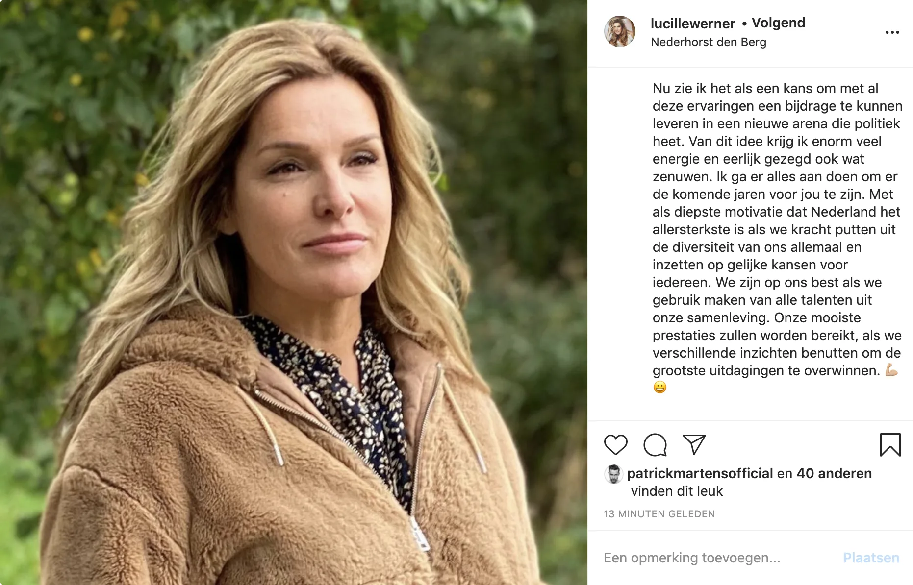 De 53-jarige televisiemaakster, die jarenlang Lingo presenteerde, licht haar carrièreswitch toe op Instagram. Ze wilde naar eigen zeggen altijd al de politiek in, zeker na het oprichten van de Lucille Werner Foundation en het organiseren van de Mis(s) Verkiezingen. "En nu is het zover", aldus Lucille.