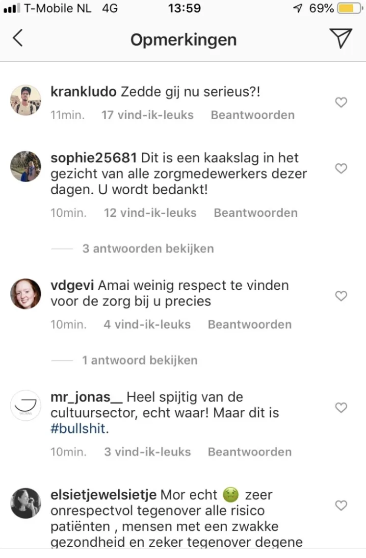 Inmiddels heeft ze de post verwijderd, maar Shownieuws heeft nog enkele screenshots in handen. Daar is ook te zien hoe enkele volgers vol afschuw reageren op de post. "Dit is een kaakslag in het gezicht van alle zorgmedewerkers deze dagen. U wordt bedankt!", Zedde gij nu serieus?!", "Amai weinig respect te vinden voor de zorg bij u precies" en "Mor echt. Zeer respectloos tegenover alle risicopatiënten, mensen met een zwakke gezondheid en zekere tegenover degene..."