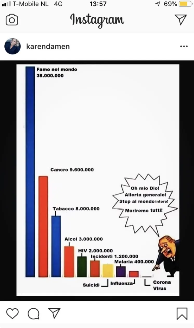 Karen Damen is overladen met kritiek nadat ze op Instagram een bericht deelde over het coronavirus. Daarin is te zien hoe het virus minder doden heeft veroorzaakt dan bijvoorbeeld HIV, malaria of kanker. Veel Belgen reageren woedend op het bericht.