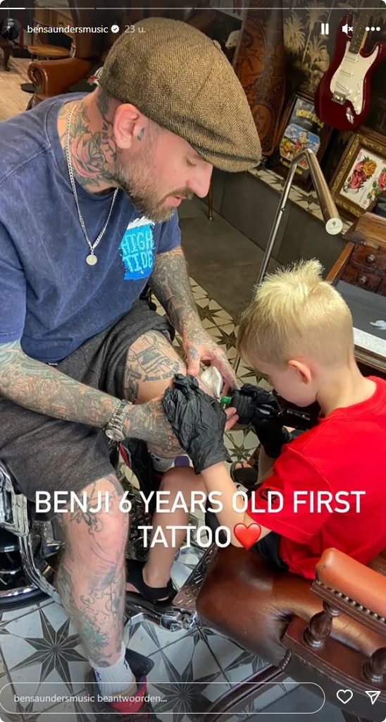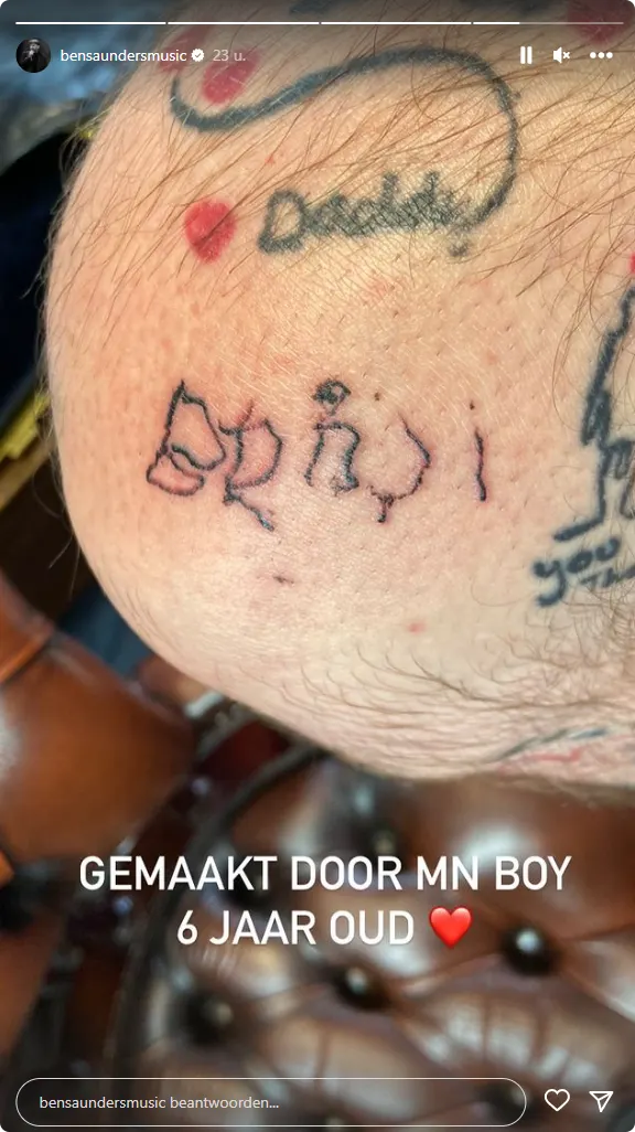 "Benji 6 jaar oud, zijn eerste tattoo", zo schrijft Saunders bij een foto in zijn Instagram Stories. Te zien is dat de kleine man op de knie van zijn vader een tatoeage aan het zetten is. Het eindresultaat is op de volgende foto te zien; hij heeft zijn eigen naam geschreven.