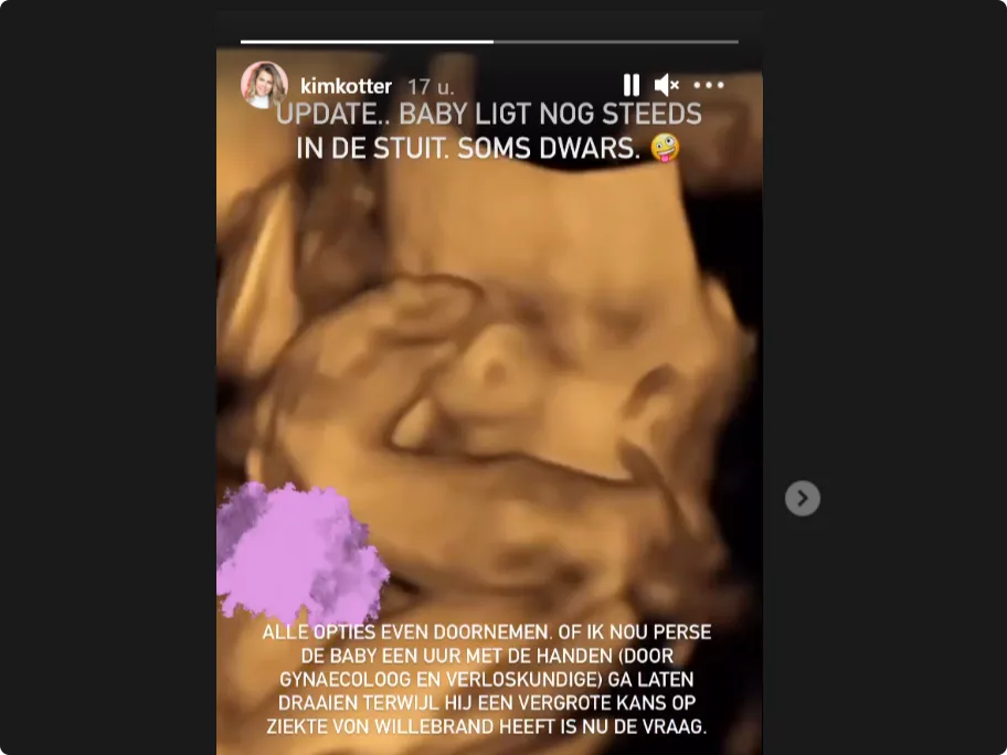 "Update: Baby ligt nog steeds in de stuit. Soms dwars", schrijft Kim op Instagram. In de stuit liggen houdt in dat de voetjes of de billen van de baby in de buik naar beneden liggen in plaats van het hoofdje. Een keizersnede is in zo'n situatie soms nodig voor een veilige bevalling. "Alle opties even doornemen", schrijft Kim dan ook.