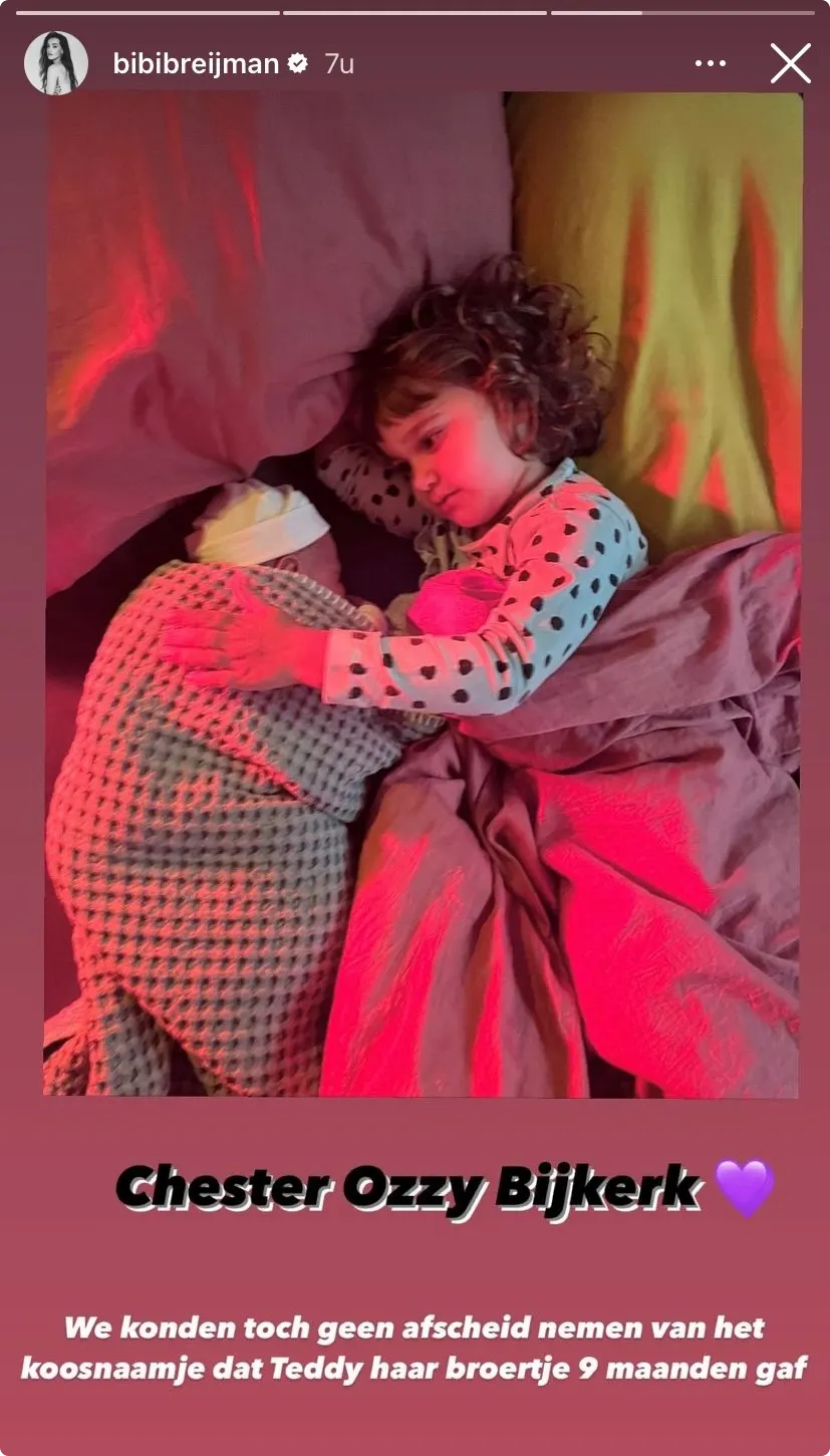 Breijman laat op haar Instagram weten dat hun dochtertje Teddy, Chester tijdens de zwangerschap altijd Ozzy noemde. Vandaar dat de tweede naam van hun kersverse kindje ook Ozzy is. ''We konden toch geen afscheid nemen van het koosnaampje dat Teddy haar broertje 9 maanden geleden gaf. Chester Ozzy Bijkerk'', aldus Bibi in haar Stories.
