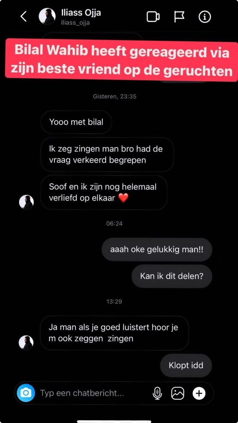 Bilal geeft via een privé bericht op Instagram duidelijkheid over de verwarring. Hij schrijft aan zijn vriend: 'Ik zeg zingen man bro, had de vraag verkeerd begrepen', 'Soof en ik zijn nog helemaal verliefd op elkaar'.