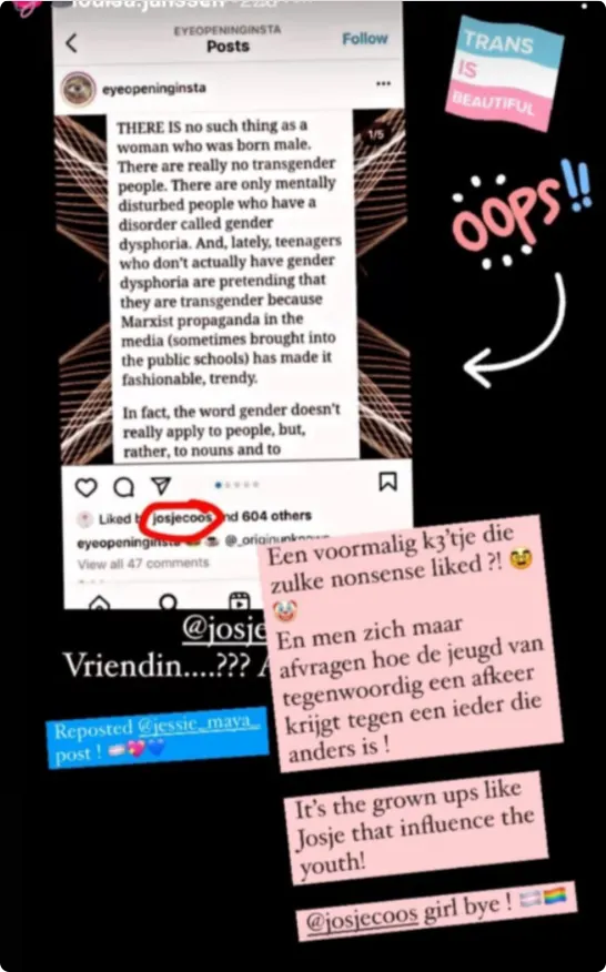 Bekende transgender vrouwen als Louisa Janssen en Jessie Maya zijn gechoqueerd door de mening van Josje. Louisa, die samen met haar man Rowan al jaren op televisie te zien is, deelt op Instagram Stories een bericht dat werd geliked door Josje. Hierin wordt gesteld dat transgenders niet bestaan en dat zij 'geestelijk gestoord' zijn.