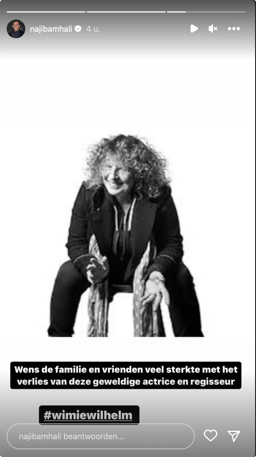 Cabaretier en acteur Najib Amhali wenst haar familie en vrienden via zijn Instagram Stories "veel sterkte met het verlies van deze geweldige actrice en regisseur".