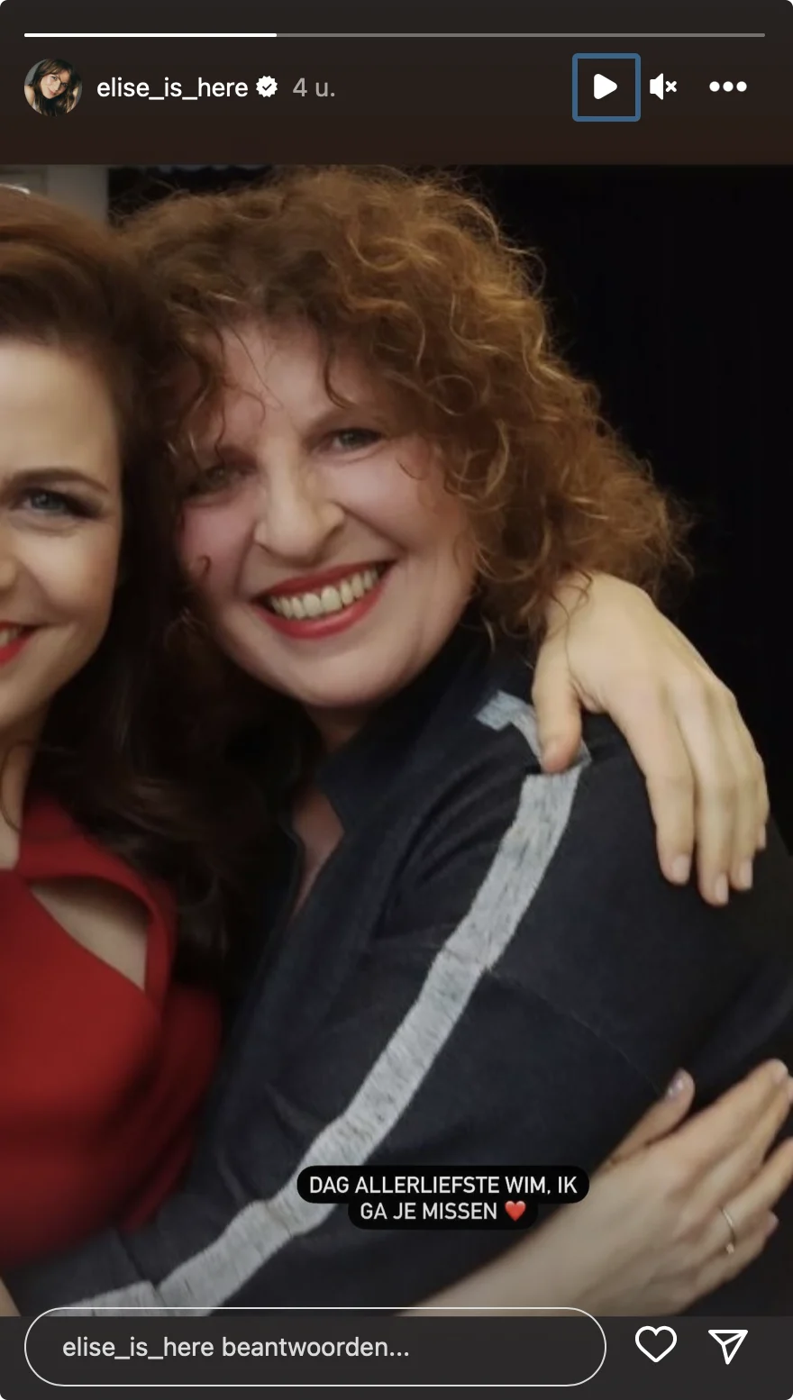 Ook actrice Elise Schaap staat stil bij het overlijden van Wimie. "Dag allerliefste Wim", schrijft Elise bij een foto van hen samen in haar Instagram Stories. "Ik ga je missen."