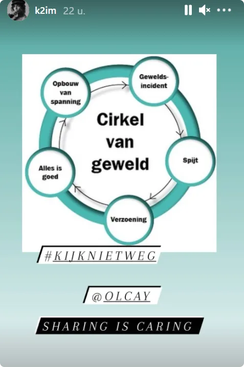 Kim Feenstra deelt de 'cirkel van geweld' van Olcay in haar eigen Instagram Stories. Ze schrijft erbij: "Kijk niet weg. Sharing is caring." Ook Miljuschka Witzenhausen steunt Olcay op social media.