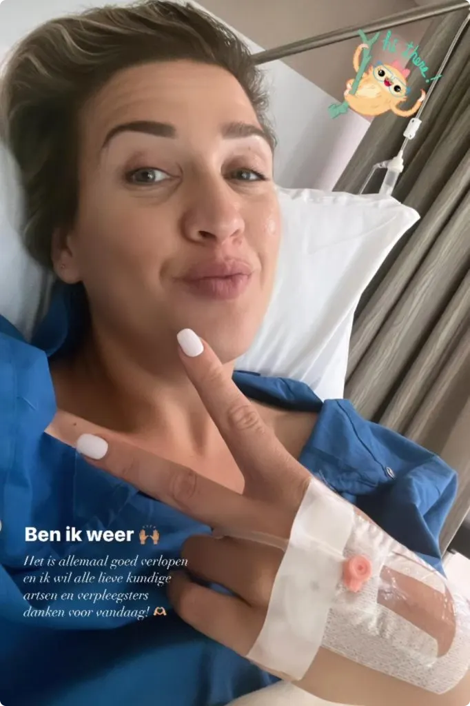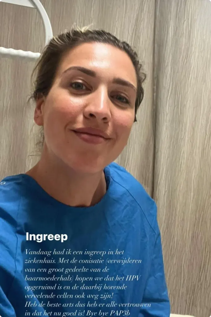 "Vandaag had ik een ingreep in het ziekenhuis", zo schrijft ze. "Met de conisatie (verwijderen van een groot gedeelte van de baarmoederhals) hopen we dat het HPV opgeruimd is en de daarbij behorende vervelende cellen ook weg zijn. Heb de beste arts, dus heb er alle vertrouwen in dat het nu goed is. Bye bye, PAP 3b, hopelijk."
