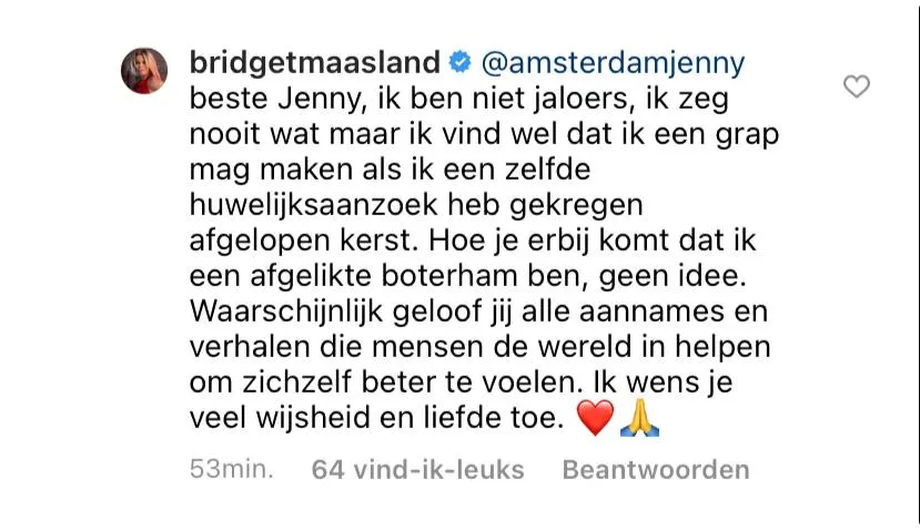 "Ik ben niet jaloers. Ik zeg nooit wat," zei Bridget tegen de vrouw die haar een 'afgelikte boterham' noemde. "Maar ik vind wel dat ik een grap mag maken als ik een zelfde huwelijksaanzoek heb gekregen afgelopen kerst." Tegen RTL Boulevard zei Bridget vervolgens dat ze ook ja heeft gezegd op dit aanzoek en André en Bridget daarmee dus verloofd waren.