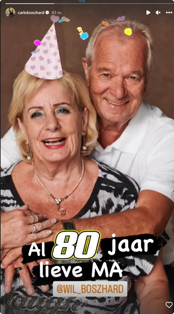 Op Instagram Stories deelt Carlo een foto van zijn moeder Wil en vader Henk. "Al 80 jaar lieve MA", schrijft hij daarbij. Bekijk onderstaand de lieve foto van het stel: