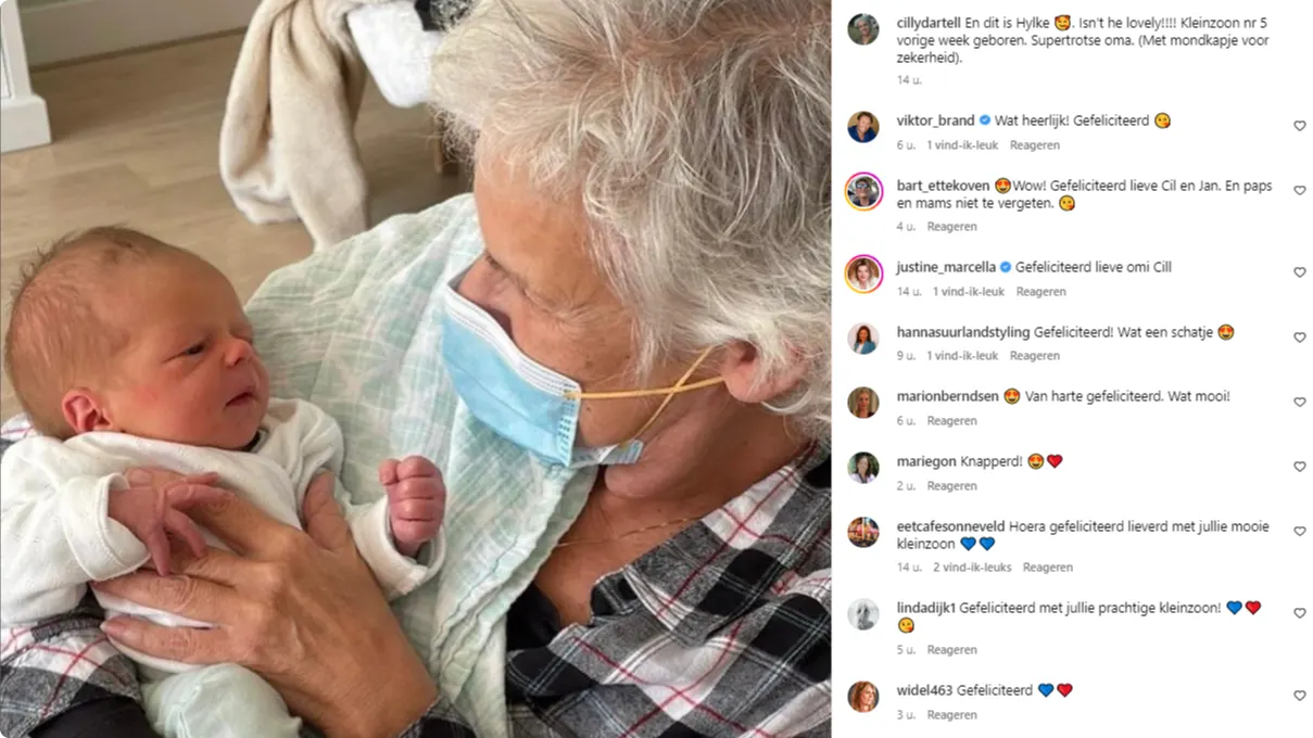 Op Instagram deelt ze een babyfoto van haar kersverse kleinzoon. "En dit is Hylke đ„°. Isnât he lovely!!!! Kleinzoon nr 5 vorige week geboren. Supertrotse oma. (Met mondkapje voor zekerheid)", schrijft ze bij het superschattige kiekje. Begin januari werd haar vierde kleinkind geboren: Oscar, zie de video bovenaan de pagina.
