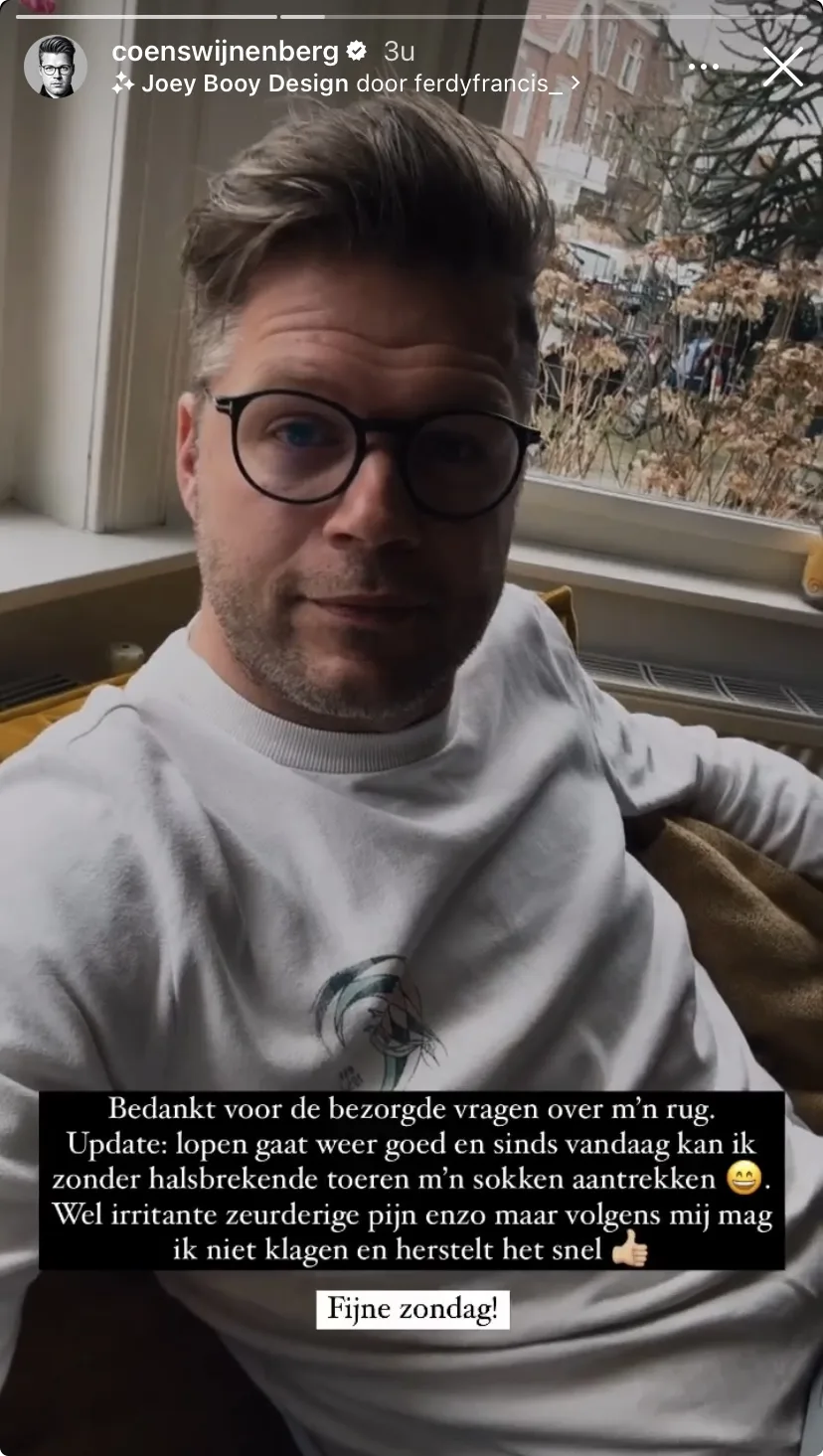 "Bedank voor de bezorgde vragen over m'n rug", aldus Swijnenberg in zijn Instagram Stories. "Update: lopen gaat weer goed en sinds vandaag kan ik zonder halsbrekende toeren m'n sokken aantrekken." Hij vertelt tot slot dat hij wel een zeurderige pijn heeft maar niet mag klagen.