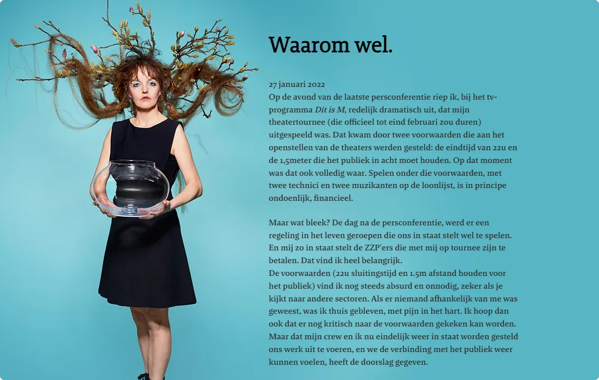 "Op de avond van de laatste persconferentie riep ik, bij het tv-programma Dit is M, redelijk dramatisch uit, dat mijn theatertournee (die officieel tot eind februari zou duren) uitgespeeld was", schrijft Wallis de Vries in een verklaring op haar website. Het was volgens de Vries onmogelijk om met een eindtijd van 22.00 uur en de de verplichte 1,5 meter afstandsregel uit de kosten te komen. Ze moest immers ook twee technici en twee muzikanten betalen.