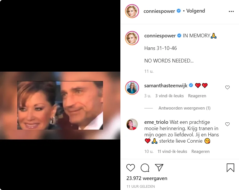 Connie deelt een filmpje met haar 80 duizend volgers waarop staat 'Ter herinnering aan Hans'. In het filmpje is het prachtige nummer 'Remember', gezongen door Connie zelf, uit 2010 te horen en deelt ze foto's uit het leven van Hans.