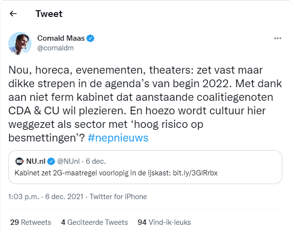 "Nou, horeca evenementen, theaters: zet vast maar dikke strepen in de agenda’s van begin 2022", voorspelde Maas op 6 december van dit jaar op Twitter. "Met dank aan niet ferm kabinet dat aanstaande coalitiegenoten CDA & CU wil plezieren. En hoezo wordt cultuur hier weggezet als sector met ‘hoog risico op besmettingen’? #Nepnieuws"