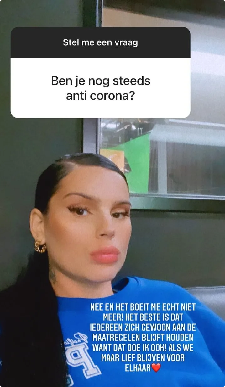 "Het beste is dat iedereen zich gewoon aan de maatregelen blijft houden, want dat doe ik ook", zegt ze. Ook drukt ze haar volgers op het hart "lief te blijven voor elkaar".