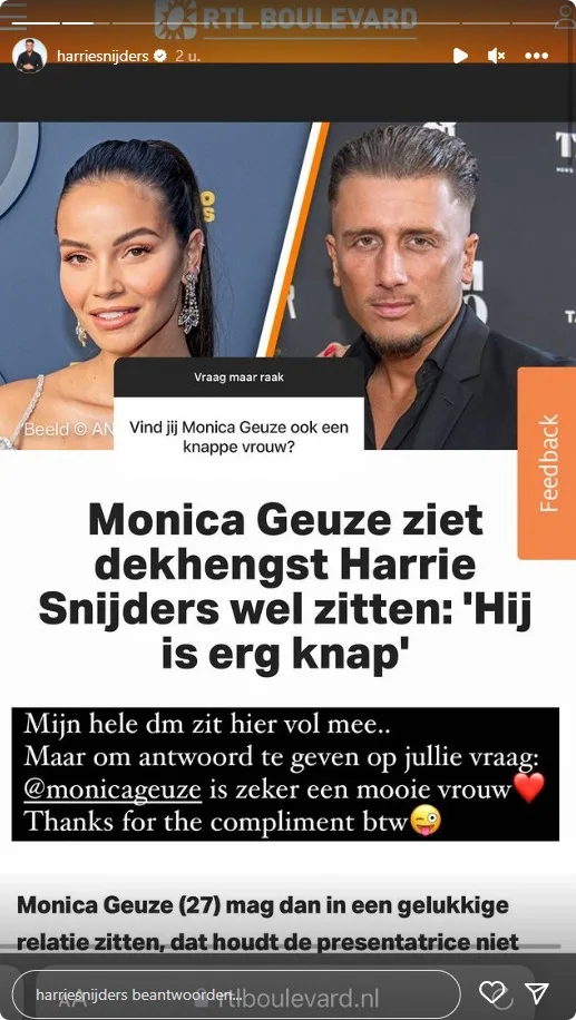"Mijn hele DM zit hier vol mee", zegt Harrie (reacties op de uitspraak van Monica over Harrie, red.). "Maar om antwoord te geven op jullie vraag: Monica Geuze is zeker een mooie vrouw. Thanks for the compliment btw."