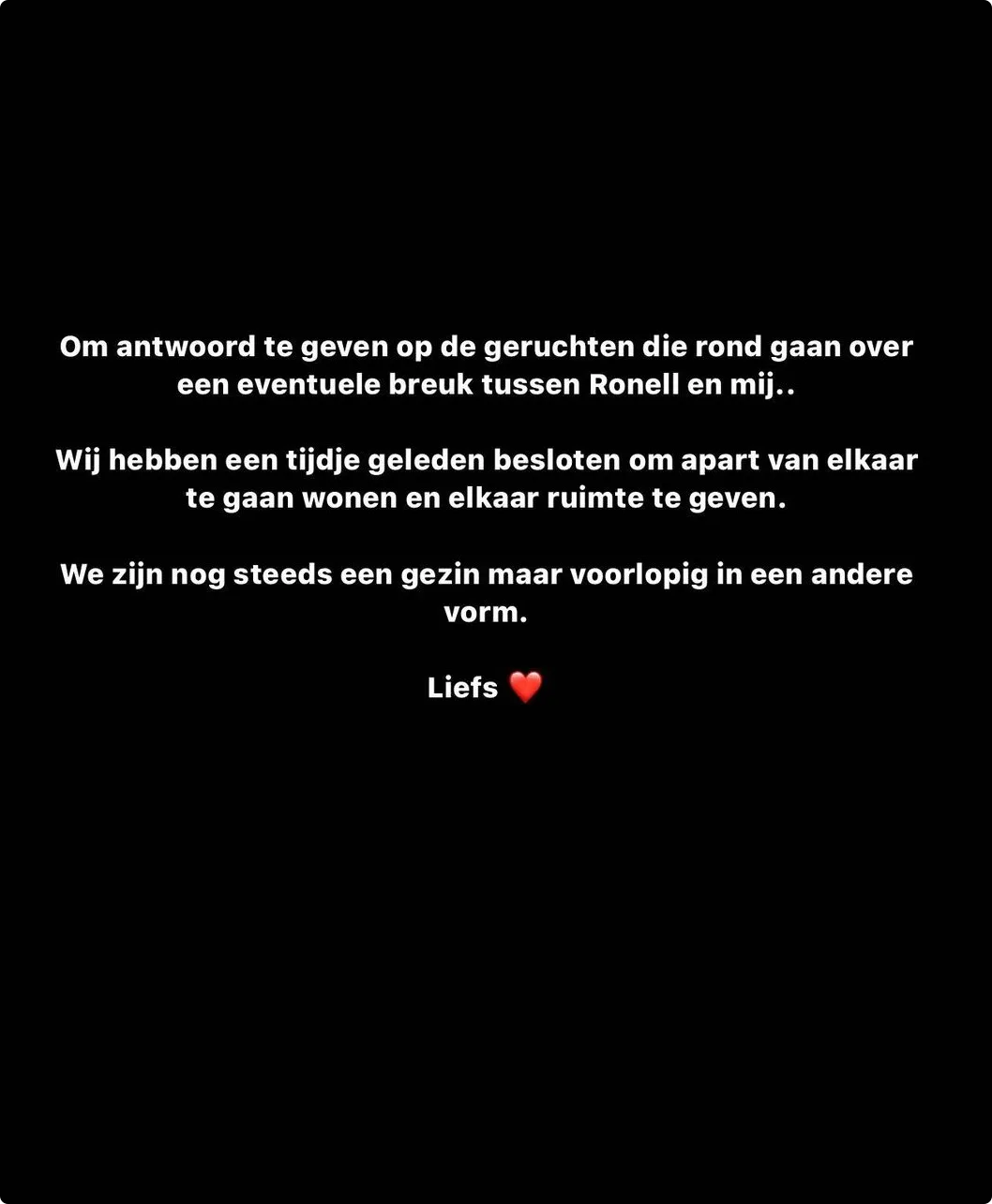 De dochter van Ronald de Boer schrijft in haar Instagram Stories dat ze elkaar voorlopig de ruimte geven, maar dat ze nog wel een gezin zijn, maar in een andere vorm. Hieronder is haar hele bericht te zien: