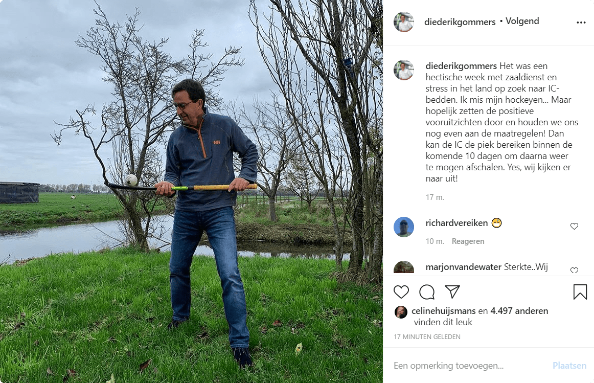 De arts, die op Instagram enorm populair is met meer dan 357 duizend volgers, blikt terug op een oude hobby. "Het was een hectische week met zaaldienst en stress in het land op zoek naar IC-bedden", schrijft hij op zijn pagina. "Ik mis het hockeyen... Maar hopelijk zetten de positieve vooruitzichten door en houden we ons nog even aan de maatregelen! Dan kan de IC de piek bereiken binnen de komende 10 dagen om daarna weer te mogen afschalen. Yes, wij kijken er naar uit!"