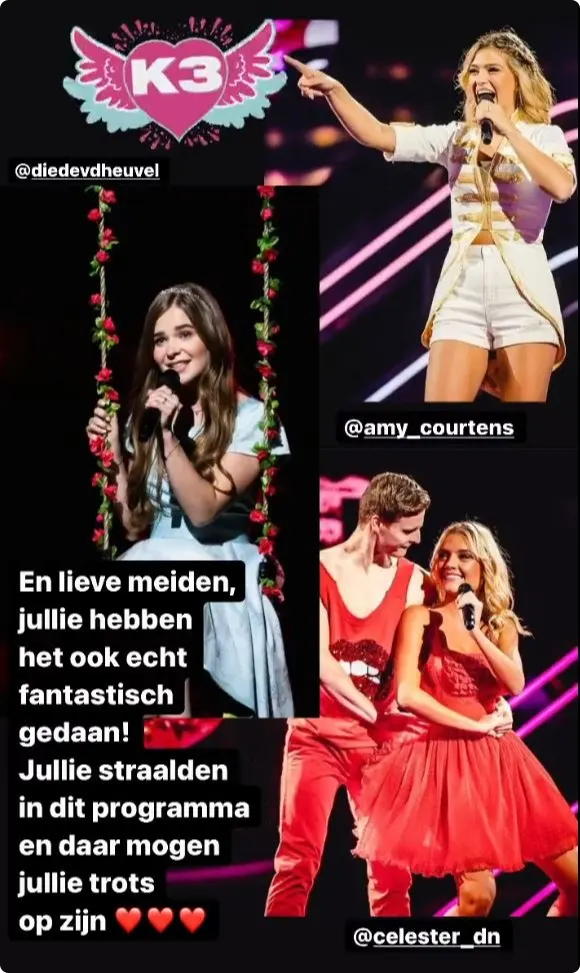 Ook voor de verliezende finalisten Diede, Amy en Celester heeft het ex-K3-lid lovende woorden. "Lieve meiden, jullie hebben het ook echt fantastisch gedaan! Jullie straalden in dit programma en daar mogen jullie trots op zijn."