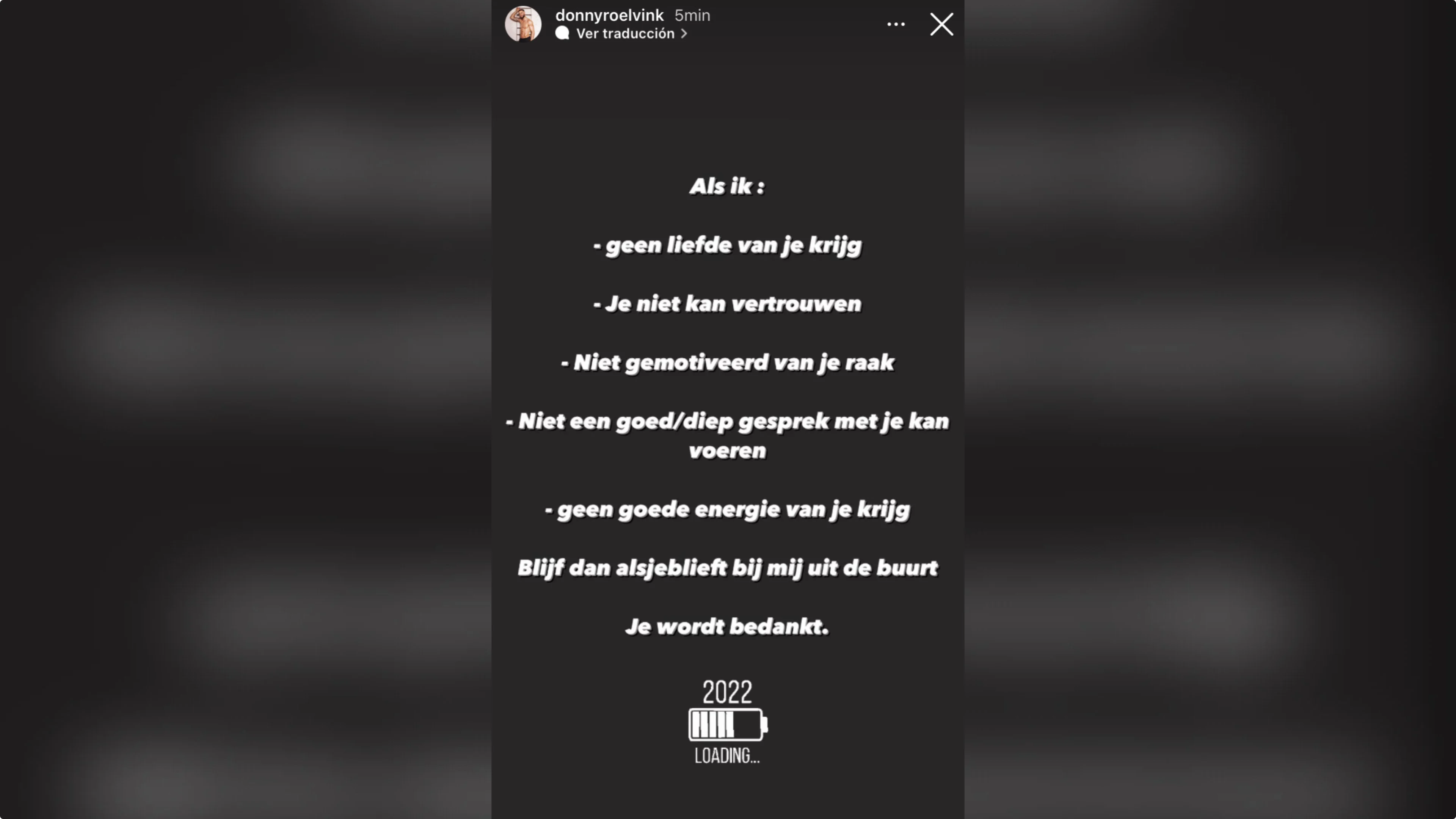 Op Instagram plaatst de Roelvink-telg een pittig lijstje waar een aantal negatieve punten van zijn vorige liefde op staan. Zo schrijft hij: "Als ik geen liefde van je krijg, je niet kan vertrouwen, niet gemotiveerd van je raak, niet een goed/diep gesprek met je kan voeren, geen goede energie van je krijg, blijf dan alsjeblieft bij mij uit de buurt." Duidelijk woorden van Donny, die het bericht afsluit met "Je wordt bedankt."