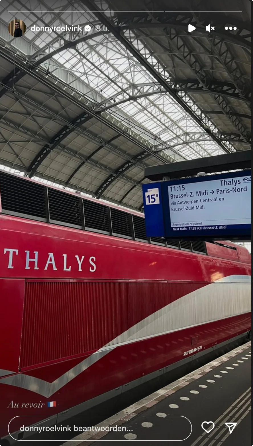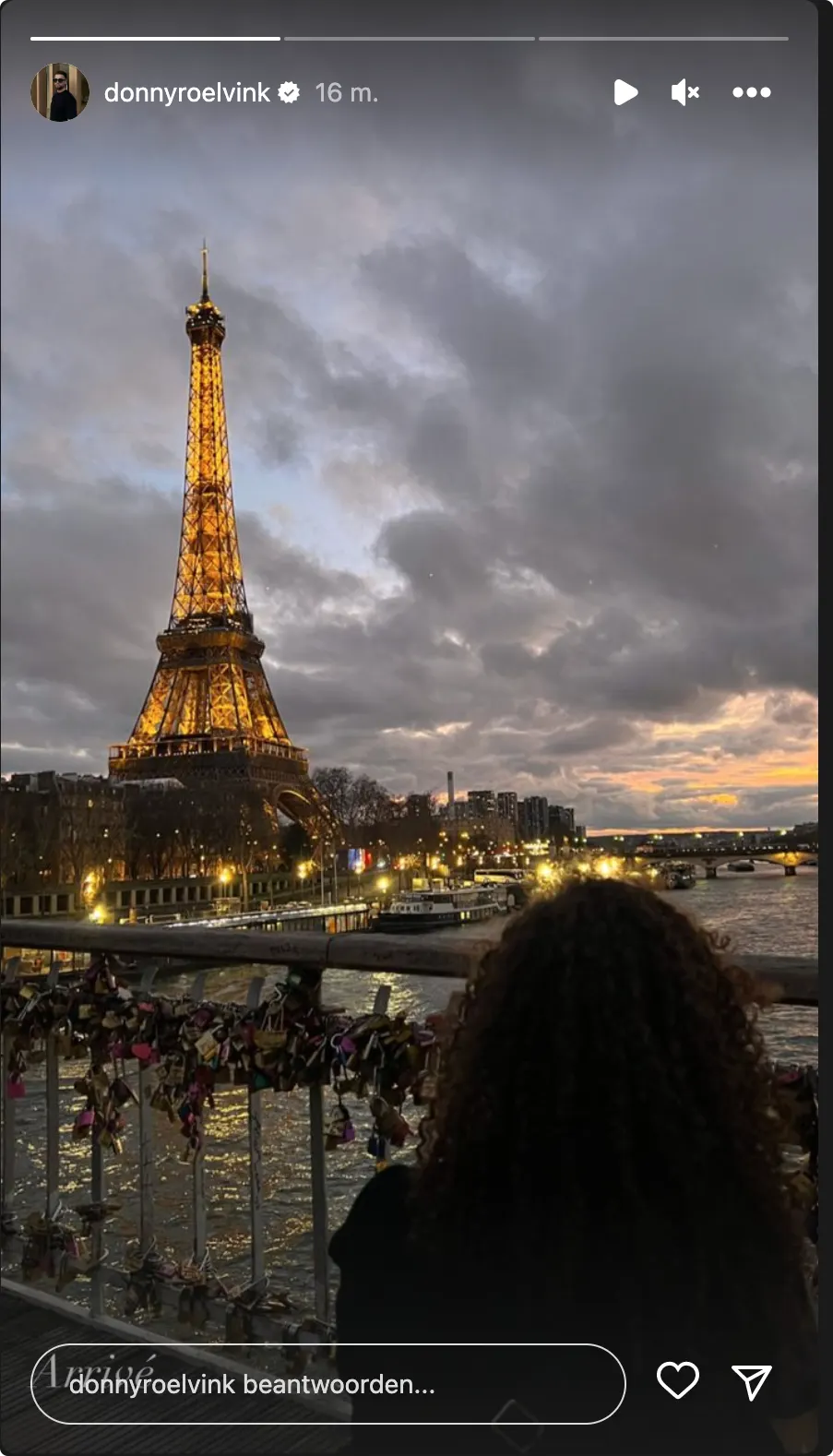 Onlangs was de Roelvink-telg ook al op reis met zijn onbekende vriendin. In de video bovenaan de pagina zie je de beelden van hun Dubai reis. Aan zijn verschillende Story's te zien is hij vrijdag op de Thalys gestapt naar de stad van de liefde. Daarna hebben de tortelduifjes de Eiffeltoren bezocht. Onderstaand zie je de Story's van Donny: