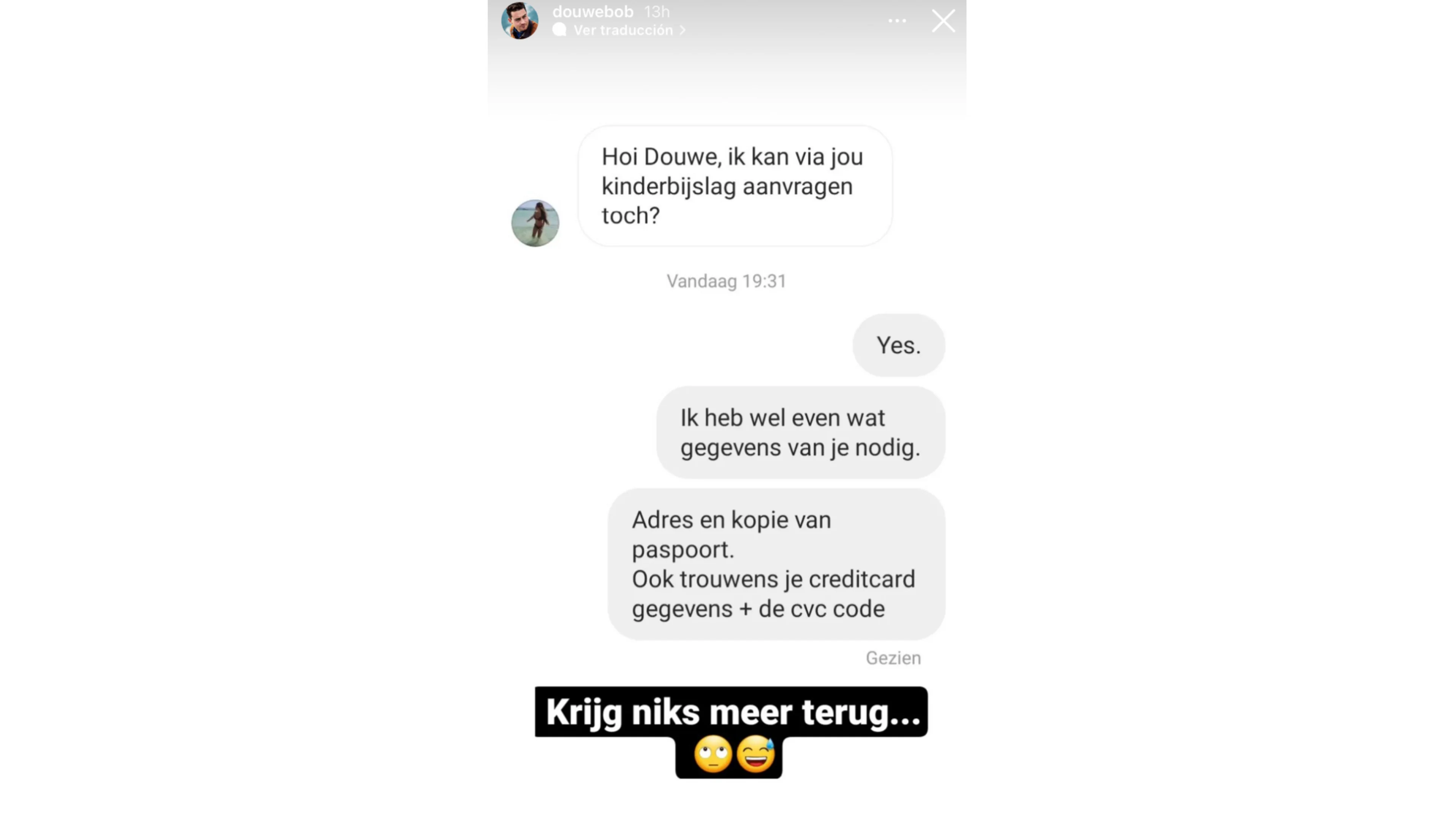 Eerder haalde Douwe ook al uit naar een grappenmaker. Iemand stuurde op Instagram naar Douwe: "Hoi Douwe, ik kan via jou kinderbijslag aanvragen toch?" De papa van bijna drie kleine spruiten reageerde vervolgens: "Yes. Ik heb wel even wat gegevens van je nodig." En vraagt gekscherend naar het adres, kopie paspoort en de gegevens van een creditcard.