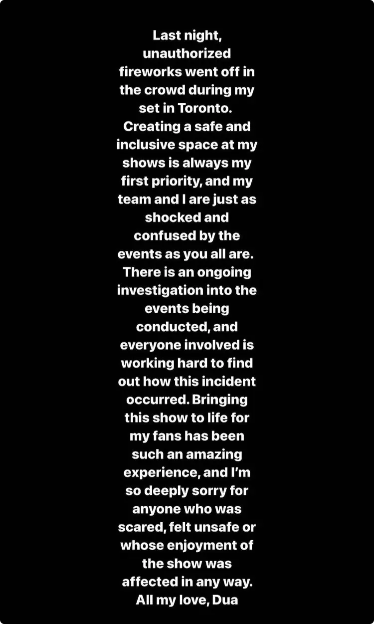 Dua Lipa heeft donderdag op Instagram gereageerd op het vuurwerkincident tijdens haar concert in Toronto woensdagavond. Daarbij raakten meerdere bezoekers gewond.