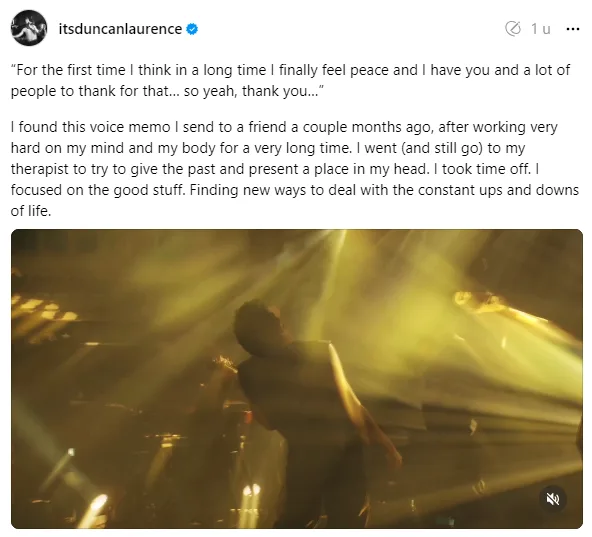 Duncan Laurence gaat nog steeds naar een therapeut om te kunnen omgaan met de ups en downs van het leven. Dat staat op het Threads-account van de zanger, die eerder dit jaar nog op een hoop kritiek kon rekenen na een optreden in Amsterdam (zie video).
