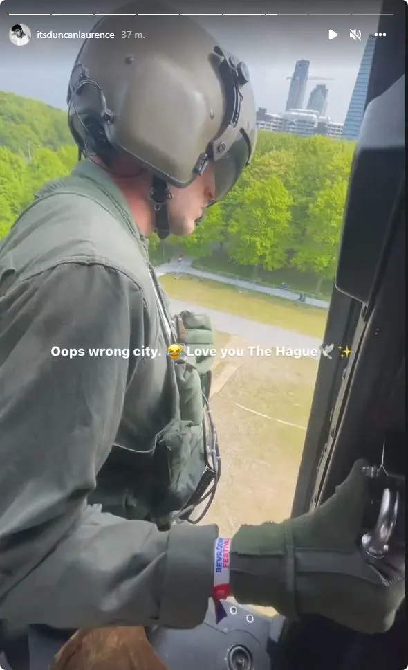 "Oeps, verkeerde stad. Ik hou van je Den Haag", schrijft Laurence bij een filmpje in zijn Instagram Stories, waarop te zien is dat hij boven Den Haag vliegt. De zanger begon daardoor iets later aan zijn show in Rotterdam.