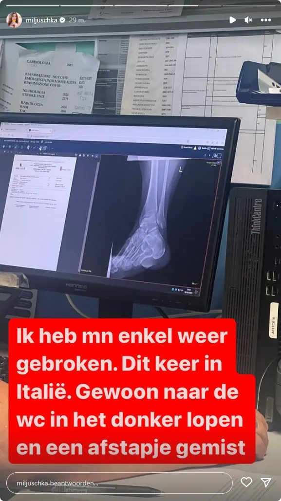 De vakantie van de foodexpert liep afgelopen augustus flink in de soep toen ze voor de tweede keer haar enkel brak. "Ik heb m'n enkel weer gebroken. Dit keer in Italië. Gewoon naar de wc in het donker lopen en een afstapje gemist", legde ze uit op haar Instagram Story.