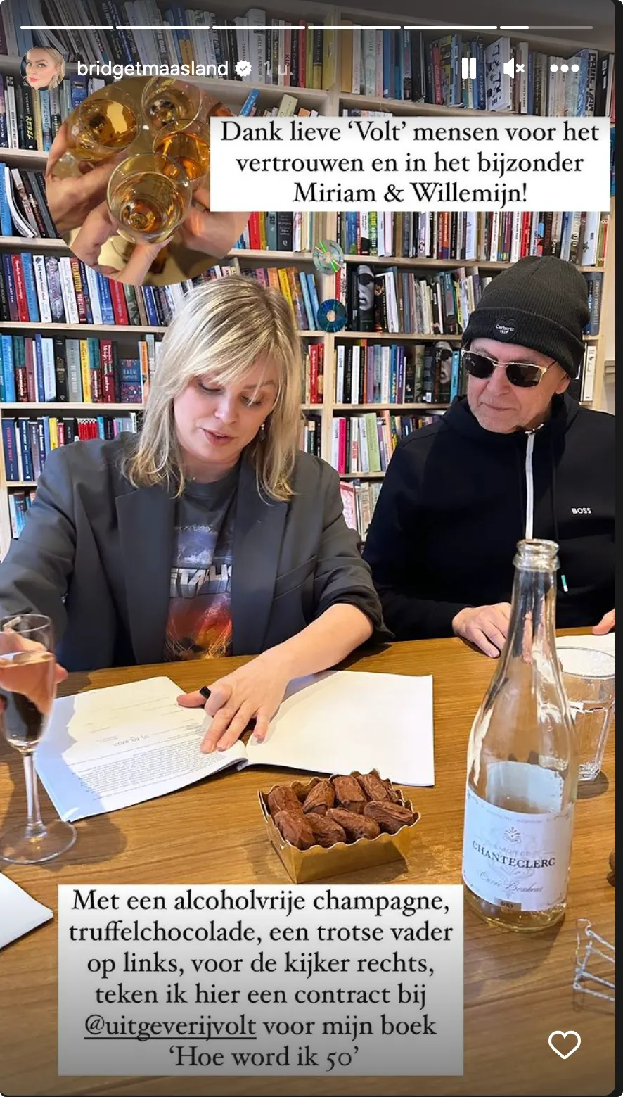 Op Instagram deelt ze een foto van het moment waarop ze haar contract bij de uitgeverij tekent. Dat doet ze "met een alcoholvrije champagne, truffelchocolade en een trotse vader".