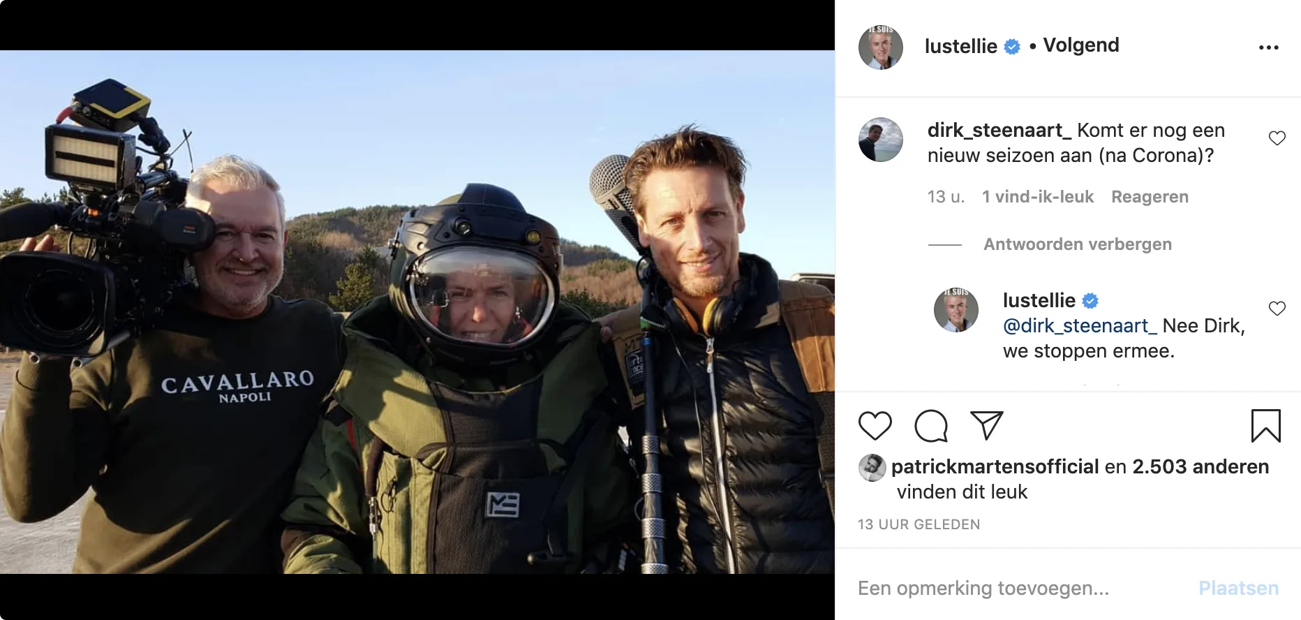 Het nieuws deelt ze op haar eigen social media. Zo vraagt een volger aan haar bij onderstaande foto: "Komt er nog een nieuw seizoen (Ellie op Patrouille, red.) aan (na corona)?", waarop Ellie antwoordt met: "Nee Dirk, we stoppen ermee." In Ellie op Patrouille loopt de presentatrice mee met verschillende politieteams van over de hele wereld. Ze wordt gehuld in bijpassend uniform en geeft de kijker een uniek kijkje van een buitenlands korps. Het derde en laatste seizoen was afgelopen voorjaar te zien op NPO1.